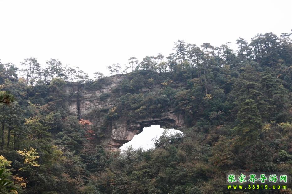 回音谷南向千米處,有一面綠叢如幔橫掛天宇的斜坡,坡上部一孔呈半月形洞開(kāi),似橋拱,長(zhǎng)約40米,高20余米。拱上有一道約200米長(zhǎng)的石梁形成橋面。此橋凌空飛架,兩端微翹,頂面寬4米,長(zhǎng)滿青松灌木。登橋賞景,清風(fēng)拂面,薄霧繞膝,碧天遼闊,橋下幽谷中七八座青峰如小樹(shù)靜立足下,環(huán)顧四周,山巒奔踴,群峰翻騰。橋之西端巖峰凌空突出十幾米,似啄向天空的鷹嘴,鷹頭滿布常青灌木,如鷹毛茸茸。鷹顎頷為灰白色巖體。鷹之嘴尖上長(zhǎng)一古松,飛出十多盤青枝。登鷹嘴撫松極目,山色盡覽。