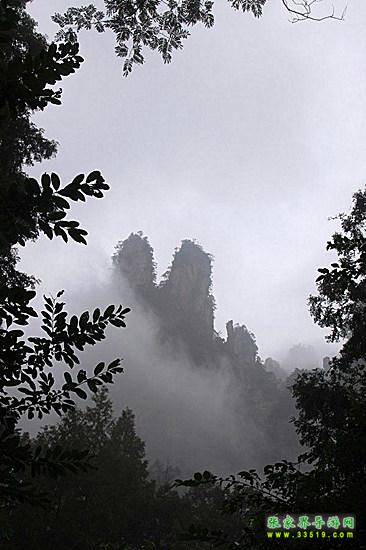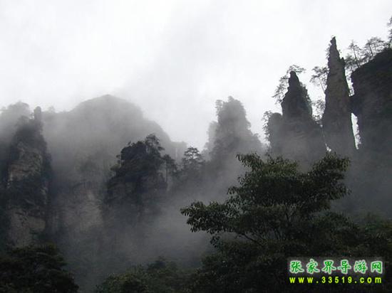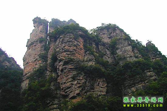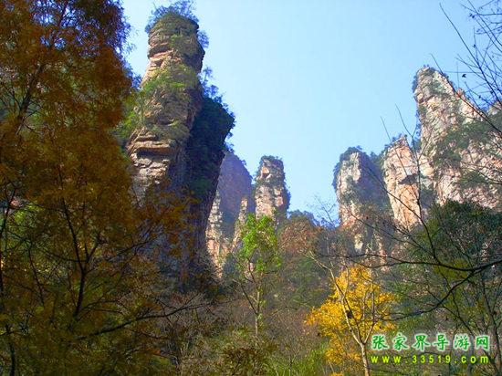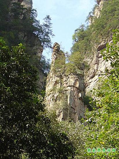 山谷中并排而立的三支山峰,有模有樣,有人叫他們“師徒取經(jīng)”,說那是唐僧、孫悟空、沙和尚三人的“合影”??催^《西游記》的朋友,可能對這片風(fēng)景有似曾相識的感覺,這兒曾是中央電視臺拍攝《西游記》的外景地。有些客人經(jīng)常問,重要人物豬八戒先生怎么沒有趕上這個“合影”呢?他忙里偷閑,在后面背媳婦去了(我們剛才不是看過“豬八戒背媳婦”那個景點(diǎn)嗎?)不小心誤了時辰。如此看來,愛情和事業(yè)有時難免會有點(diǎn)矛盾。