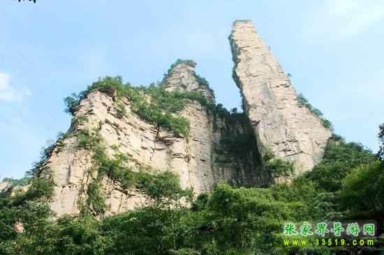 說到討好老婆,豬八戒可謂這方面的專家。您回頭看,不遠(yuǎn)處一支長有一些小樹的石峰,頂部分了丫,像一個英文字母“Y”,很像頭戴綠色小帽的豬八戒背著他身材嬌小的老婆(有人開玩笑說他戴的是“綠帽子”,背的是“小老婆”)。小老婆撐著一把小陽傘,還正在背上一扭一扭的呢!八戒的嘴最形象,嘟得老長,好像背了很久,累得不行了,正喘著粗氣——您千萬可別看不起豬八戒先生,他魅力足著呢,他不但能吃會玩、開朗大方,而且溫柔多情,雖說長相“安全”了一點(diǎn),但特別擅長哄女孩子開心,不少窈窕淑女就喜歡他這種“好逑的君子”。