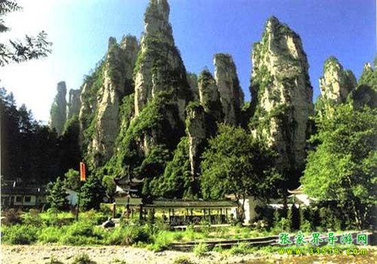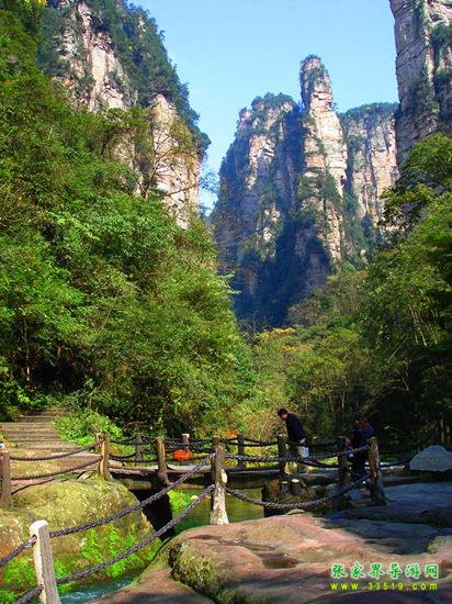 金鞭溪因流經(jīng)金鞭巖而得名,全長5700米,穿行於絕壁奇峰之間,溪谷有繁茂的植被,溪水四季清澈,被稱為“山水畫廊”、“人間仙境”。有詩贊曰:“清清流水青青山,山如畫屏人如仙,仙人若在畫中走,一步一望一重天”。途中你會看到點(diǎn)歌臺,那里有土家姑娘時刻準(zhǔn)備為游人唱民族歌曲,只要付十元錢她們就會為你引吭高歌,當(dāng)然,如果你不想花這個錢,也可以在一邊聽聽別人點(diǎn)的歌,聽完后走人。