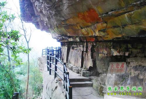 羅漢迎賓上方西南側(cè)石壁上,有一處空間高約3米、深1-3米、長20多米的巖屋,是絕妙的觀景臺。登臺南眺,遠山如黛。近處左上側(cè)有石峰數(shù)座,倚天而列。北邊一峰類人,西向側(cè)面而立,似頭著兜鍪,身披甲胄,左臂下垂,傲視藍天,游人戲稱“獨臂武將”。巖屋下20米,一峰如葫蘆豎立,高約30米,直徑約10米,底、肚、頸、口俱全,附生的草木如花紋圖飾,一塊重達數(shù)噸的石板蓋于口上,稱”仙丹葫蘆“。對面一組山峰形如駱駝踽踽東行。駱駝前方是一山坡,有草無樹,夏日青似草原,秋天黃如大漠,駱駝正向那里走去。
