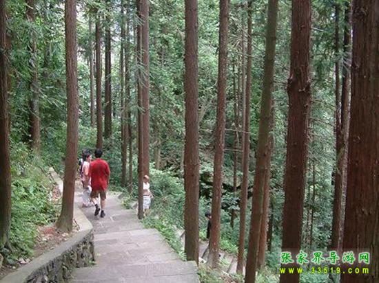 這一大片杉樹林是由張家界國營林場(張家界國家森林公園的前身)工人們種植的。過去“大煉鋼鐵”運動,差點把張家界的山頭全部變成了光頭。后來,一些林場工人抱著“頭發(fā)白在張家界,牙齒掉在張家界,死了埋在張家界”的決心,“獻了青春獻終身,獻了終身獻子孫”,發(fā)誓要植樹造林,綠化張家界。幾十年過去了,許多人綠了青山白了頭,他們的心愿終于變成了眼前的現(xiàn)實。腳下這條彎彎曲曲而又平平整整的游道是20世紀80年代修建的。漫步其上,山風陣陣、鳥雀聲聲、奇花朵朵,群峰在樹林中若隱若現(xiàn),很有“蟬鳴林逾靜,鳥鳴山更幽”的幽靜與“采菊東籬下,悠然見南山”的悠然。