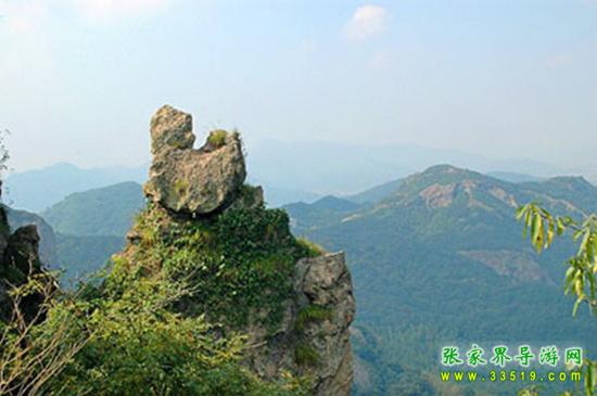 兩支山峰圍成一道天然小石門,大有“一夫當關(guān),萬夫莫開”之勢,人稱南天門,據(jù)說過了這道門就是天堂。不過,說來也奇怪,穿過山門之后,山勢為之一變,奇峰怪石,蒼松翠柏,美不勝收,不是天堂,勝似天堂。前面這支位于南天門身邊高200多米的孤立石峰,叫南天一柱。它與一般的山峰不大相同,一般的山峰是下面粗、上面細,而它是上面粗、下面細。山風吹來,這根石柱好像搖搖欲墜,驚心動魄之余,仿佛耳邊還能隱隱約約聽到億萬年前地殼運動時發(fā)出的轟隆隆的巨響——為了“安全”我們還是繼續(xù)往前走吧。