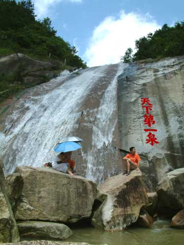 水簾洞瀑布源頭,在紫蓋峰的泉水。三支泉水匯集一起,流入水簾洞上方谷地。谷地闊三丈,原是梁朝的九位真人白日飛升的棲息之地,后建造九仙觀。九仙觀附近有太陽泉、洗心泉、洞真源、仙人池等。相傳泉水深不可測。泉水從石壁上飛流直瀉,發(fā)出雷鳴般的聲音,聲傳十里。明朝張居正游此地后說:“瀑泉灑落,水簾數(shù)疊,掛于云際,垂如貫珠,霏如削玉”。確實,它從絕壁上噴瀉下來,寬達三太,高五十余米,瀉珠濺玉,仿佛一幅巨大的白布簾,在石壁當中被亂石嶙巖擋住,然后再從石縫里屈曲折射,跳躍出來,滿谷水花四濺,閃爍著晶瑩奪目的光彩。水簾絕壁下的碧潭,天上的云彩和兩邊的蒼翠的山巒,構(gòu)成一幅美麗的山水。明朝張居正作《水簾洞》一贊道:“誤疑瀛海翻瓊浪,莫擬銀河倒碧流;自是湘妃深隱處,水晶簾掛五去頭”。這首詩可說是寫出了水簾洞的光、聲、影三絕的奇景了。