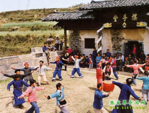 “擺手”,土家語(yǔ)稱為“舍巴”。原為“男女齊集歌舞,祓除不祥”的帶有原始宗教性質(zhì)的集體舞蹈。過(guò)去多在農(nóng)歷正月初六至十五日晚餐之后舉行。屆時(shí),人們聚集擺手堂前,先舉行祭祀儀式,然后敲鑼打鼓,鳴放鞭炮,眾人圍圈而舞,盡情歡跳。具體方式,人數(shù)不限。由一人在圈中司鼓鳴鑼,男女舞眾圍成圓圈,隨鼓點(diǎn)進(jìn)退,變換舞姿。一般手與腳成順向同時(shí)動(dòng)作,兩人一組,面面相對(duì),踢踏擺手,翩躚進(jìn)退,扭腰旋轉(zhuǎn),矯健有力。套式和內(nèi)容多種多樣。每舞一周或數(shù)周換一套程式,表現(xiàn)征戰(zhàn)、狩獵、勞動(dòng)和日常生活等不同內(nèi)容。