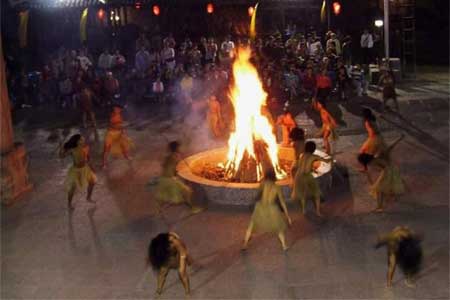 擺手舞的形式一般是這樣的:在擺手堂的中央高掛龍旗,四方點燈,由金童玉女給土家人用銅盆洗手,再從香火山取來神火,然后在龍旗下點燃3堆篝火。隨著3聲炮響,先由梯碼法師(巫師)手舉八寶銅鈴作前導(dǎo),大家跟著翩翩起舞,徹夜不眠。