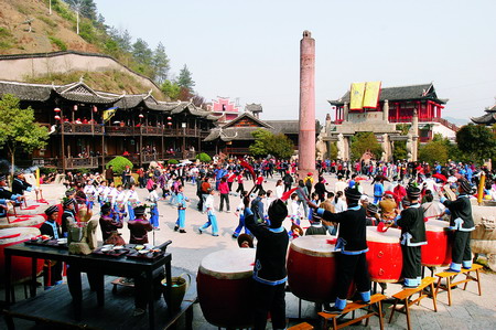 三棒鼓,唐代稱三仗鼓,明沈行符《顧曲雜言》 曰:“吳下何來有打三棒鼓乞錢者,余幼時有見之也, 起于唐咸通中(公元865年)”約于明代傳入本境, 并逐漸成為群眾增聞樂見的民間藝術(shù)形式。每年春節(jié) ,藝人們結(jié)伴走村竄寨拜年,表演對象不分貧富,戶 戶必到。如遇貧寒之家,表演者將別家贈送禮品相送 ,意在人人過節(jié)歡喜。充分體現(xiàn)出土家族人熱情好客 ,心地善良的民族性格,對加強民族團結(jié)有一定作用 。 三棒鼓通常由三至五人組成,一人擊鼓唱詞,一 人鑼鈸配樂,一人?;ò??;ò羧L一尺,舞者 左右手各持一根,將另一根拋在空中,左右開弓,擊 打空中花棒使之不落地。也有以刀代棒,以五刀代三 棒的技藝。技藝高強者,突然把刀拋得極高,來一個 眼花繚亂,不禁稱絕。打三棒鼓,通常有“鬧春耕” 、“收割打場”、“慶豐收”、“拜年節(jié)”四套,分 “鯉魚跳龍門”、“玉女穿梭”、“板巖漂灘”等項 目。打三棒鼓技巧性強,表演時需高度集中,用力適 當,貫通一氣,并與演唱者默默配合。