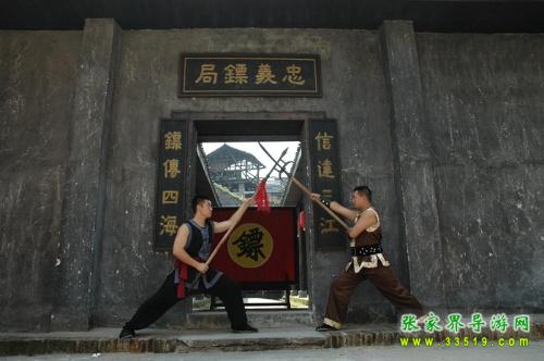 忠義鏢局,它始建于清乾隆四十二年(1777),位于洪江龍船沖,這里會館、錢莊、豪宅林立,堪稱洪江的曼哈頓。與我們在古商城看到的窨子屋不同,這是一座典型的北方四合院,前庭后院,布局嚴謹,軸線明確,左右對稱,主次分明。前院是鏢師練功習武之地,墻壁上書有“忠”、“孝”、“禮”、“義”四字和“十八羅漢練功圖”;后院為鏢師起居和洽談生意之所,內(nèi)供奉關武大帝。忠義鏢局主要為豪商巨賈押運銀票、貨物,看家護院,坐夜守店,也開館收徒,傳授武藝。忠義鏢局的掌門人劉大鵬,湖南長沙人,幼時即入嵩山少林寺習武,不僅精通十八般武藝,而且頭腦精明,他把鏢局開在這洪江最繁華的金融一條街,足見他的經(jīng)商意識和人面廣了?,F(xiàn)在忠義鏢局現(xiàn)場表演古代押鏢、行鏢全過程,是人們了解中國古代鏢行歷史文化的活性博物館。有興趣的朋友可以去洪江古商城親自感受一下當時押鏢的情景吧。