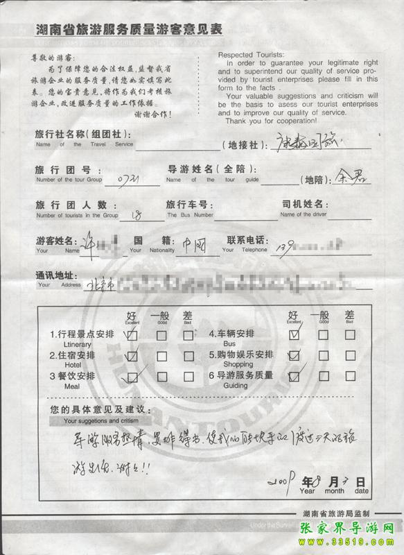 2009年7月31日北京許先生一行18人接待質量反饋單: