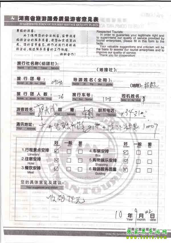 2010年9月22日廣東郭先生旅游質(zhì)量反饋