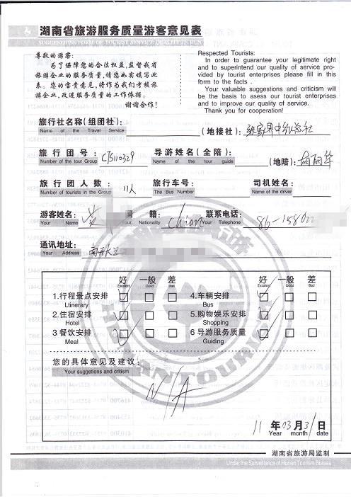 2011年3月31日黃先生一行11人旅游質(zhì)量意見(jiàn)反饋