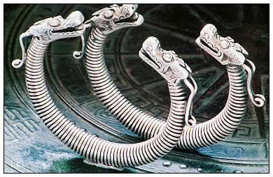 銀飾以其多樣的品種、奇美的造型和精巧的工藝,不僅向人們呈現(xiàn)了一個瑰麗多彩的藝術世界,而且也展示出一個有著豐富內涵的精神世界。銀飾的種類較多,從頭到腳,無處不飾。除頭飾、胸頸飾、手飾、衣飾、背飾、腰墜飾外,個別地方還有腳飾。