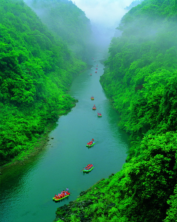 7點準(zhǔn)時等在萊頓大酒店門口,猛洞河漂流180元/人,漂流的車一般會來接參加漂流的客人的,上了車已經(jīng)有好幾位游客,然后車子又去接了幾位,7:30人接齊,離開張家界去猛洞河,車程約1個半個小時,漂流約2個半小時。在萊頓大酒店的那個晚上張家界半夜打雷下雨,我們想今天水很大,漂流會很刺激。到了那邊才知道上游建了水壩調(diào)節(jié)水量搞平均主義,所以漂流的驚險度一般般了,后來去鳳凰公路上比較顛簸,我戲稱可以將車當(dāng)船補足漂流的感覺,呵呵。不過瀑布因此壯觀不少,漂流沿途至少見到有七八條瀑布,非常漂亮。